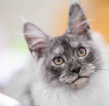 Le Black Smoke (Blue) est une robe sombre et nuancée, où un sous-poil clair et argenté contraste avec des pointes foncées aux reflets gris bleutés. Cet effet fumé crée une apparence profonde et mystérieuse, très recherchée chez le Maine Coon.